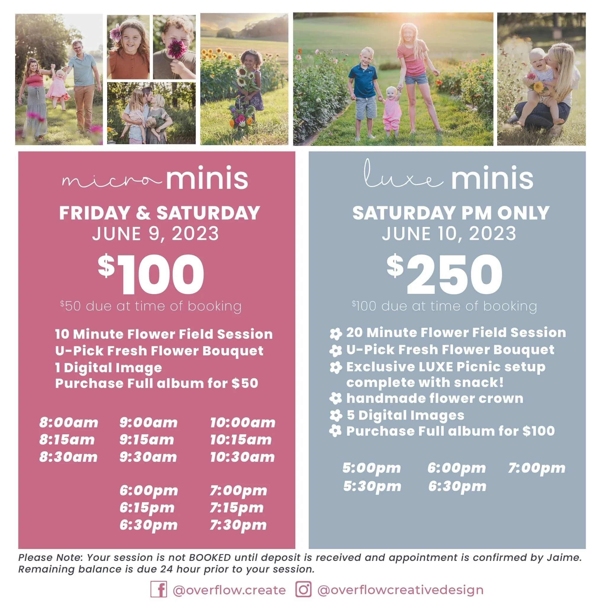 Micro and Luxe Mini photo sessions in the flower field powered by Overflow Creative! Contact Overflow Creative to book!